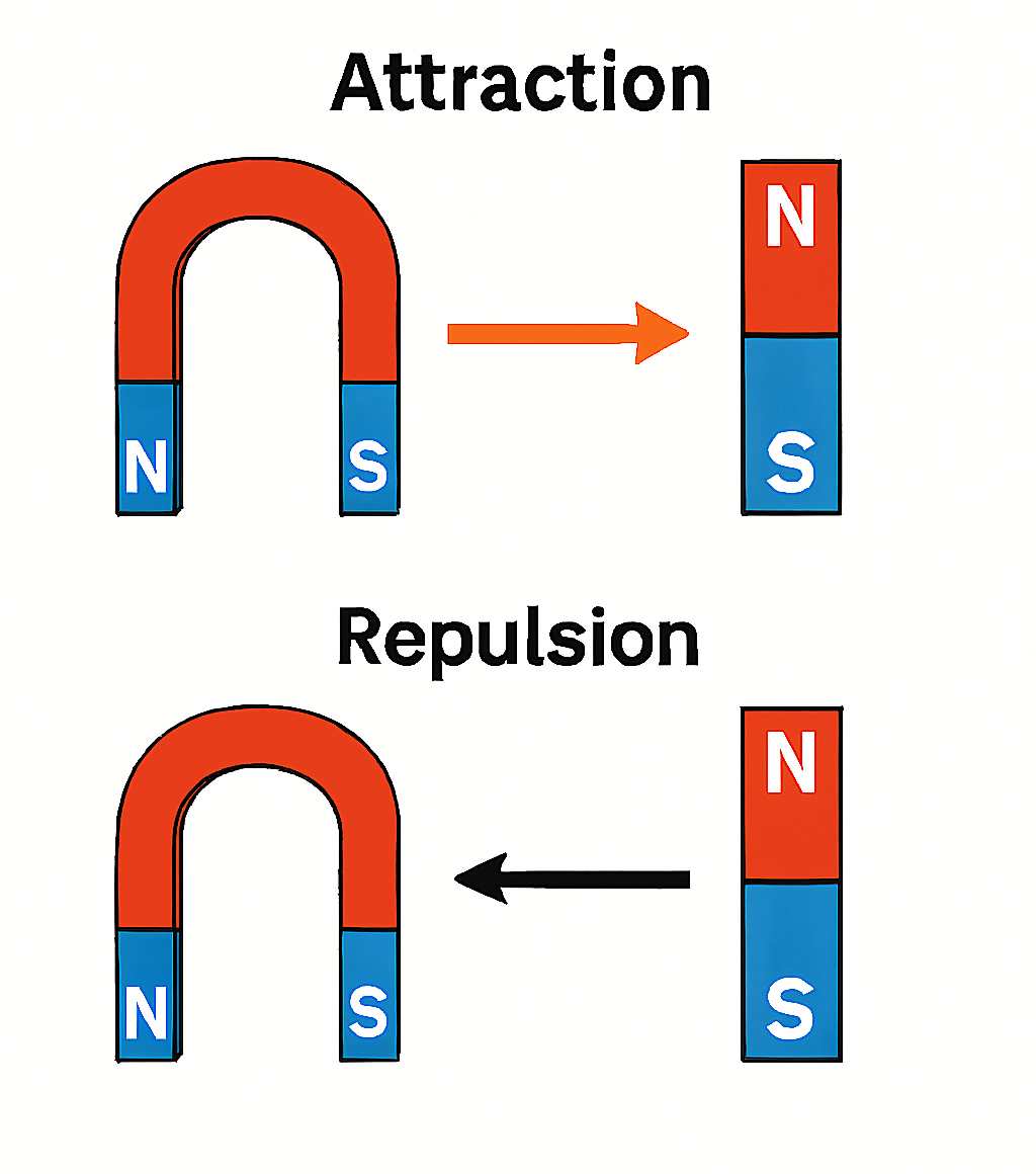 Showing attraction and repulsion between magnetic poles